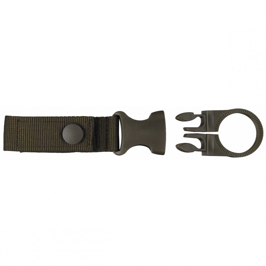 Ринг за бутилка, ''OD green''  , за колан и система "MOLLE"  подходящ за най-често срещаните пластмасови бутилки за напитки ,  лесно изваждане на бутилката чрез държач със щипка  ,  сигурно закрепване с примка със закопчалка на кука и примка . Размер на контура: ок. 2,5 х 7 см Обща дължина: ca. 16 см Ширина на държача: ок. 3,5 см Материал: Примка: 100% полиестер Държач: 100 % полипропилен