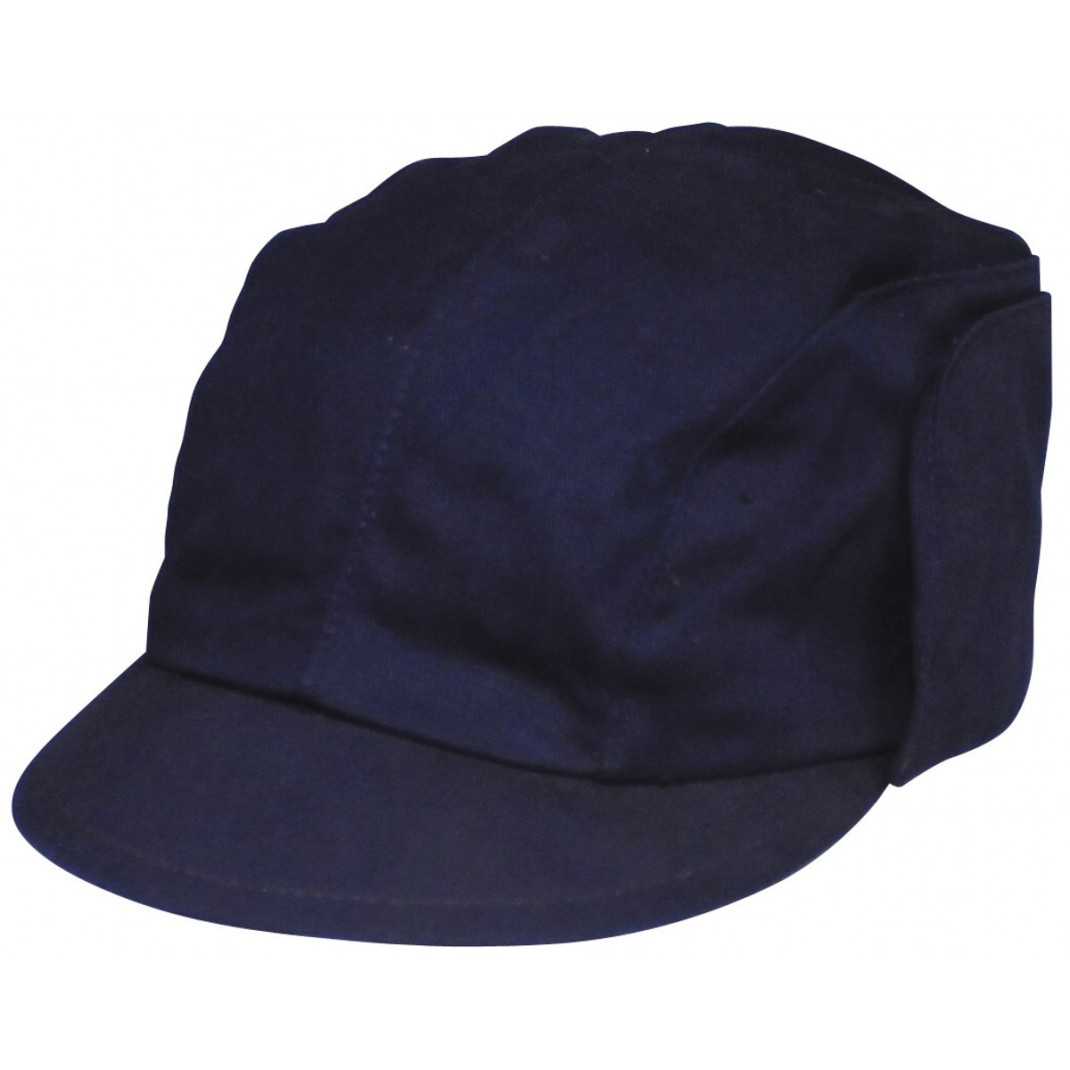 Шапка с козирка и наушници , цвят син , двупластова , много подходяща за зимни условия . Наушниците могат да се прибират и захващат към шапката с метални капси .Материал , 100% памук .